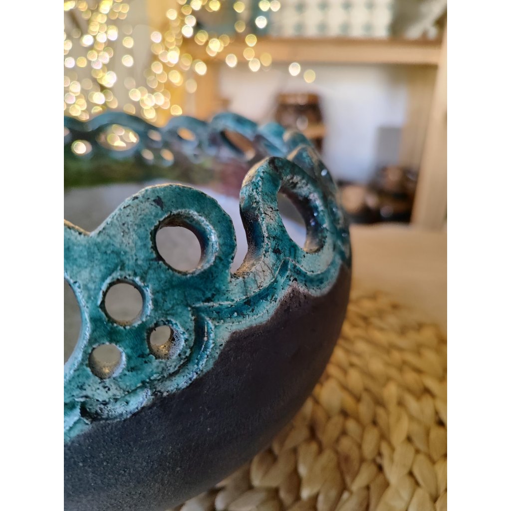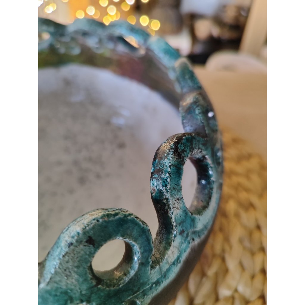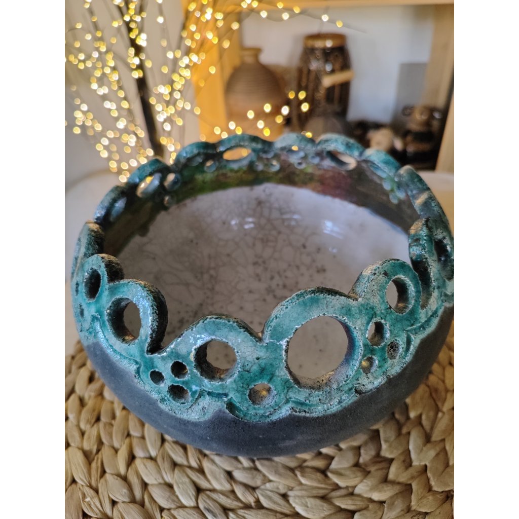 Ez a gyönyörű fekete-türkiz raku kínáló tál egyedi és modern megjelenésével bármilyen étkezést feldob. Kézzel készült, a raku technika különleges égetési folyamatának köszönhetően minden darab egyedi és megismételhetetlen.
