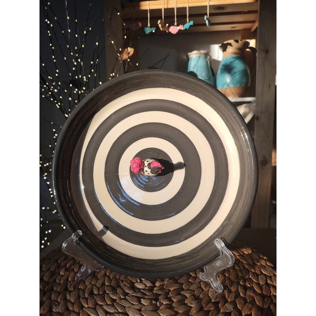 Nem hétköznapi tál, hanem egy mini csodavilág: fekete-fehér csíkos dizájn, és a közepében egy apró, kendermagos tyúkocska, aki úgy ül ott, mintha épp a világ legfontosabb tojására vigyázna. Ez a tál a rusztikus báj, a humor és az otthon melege egyetlen darabba öntve!