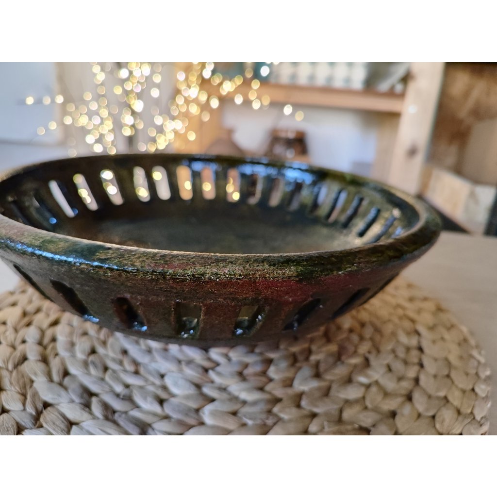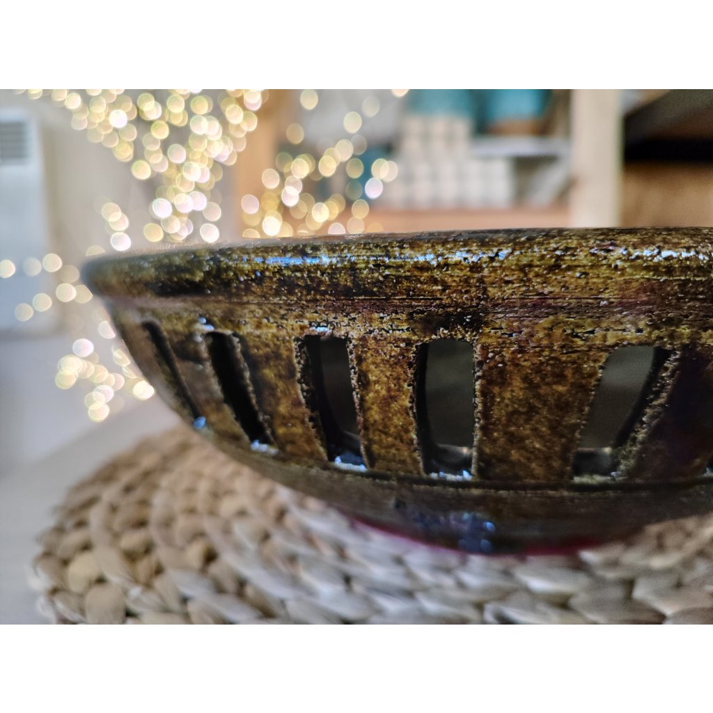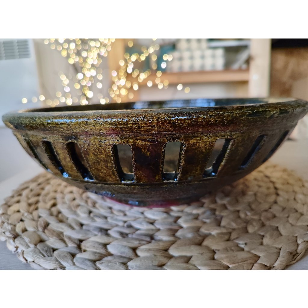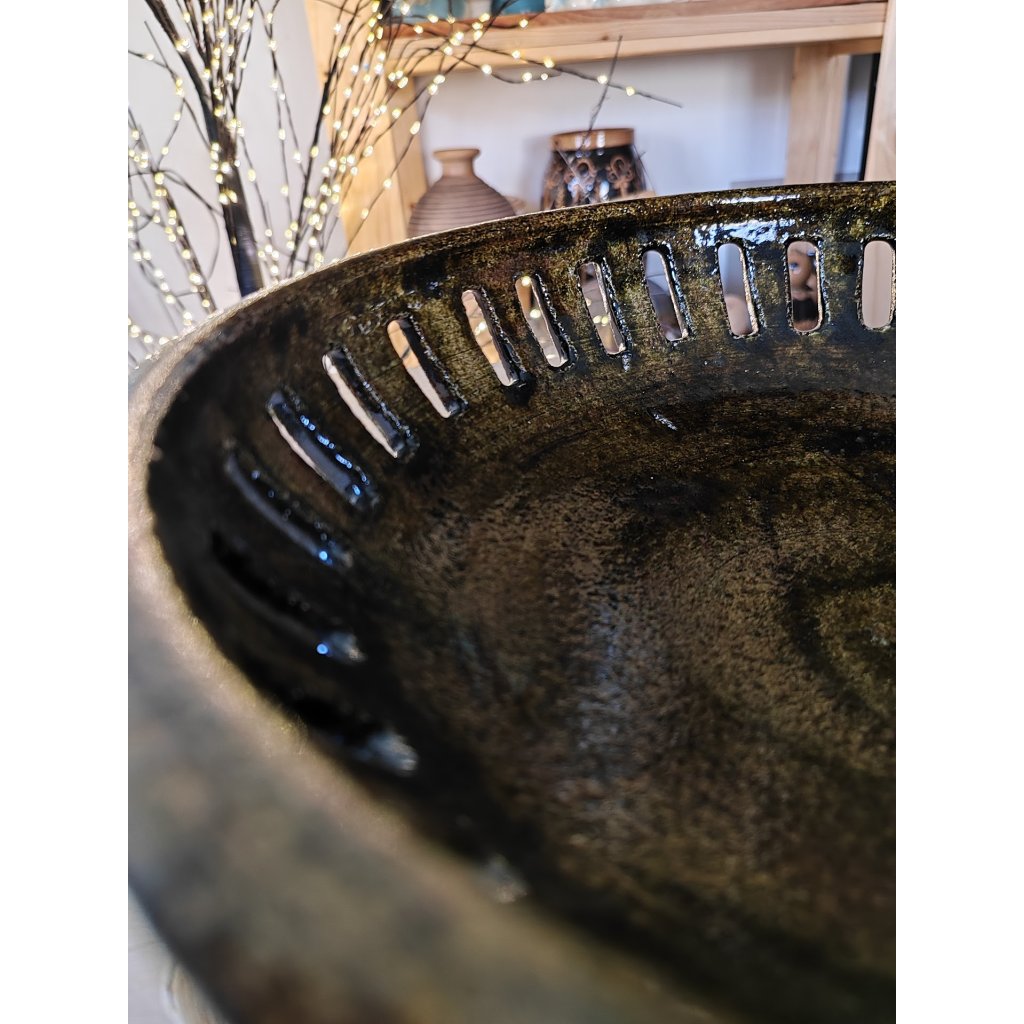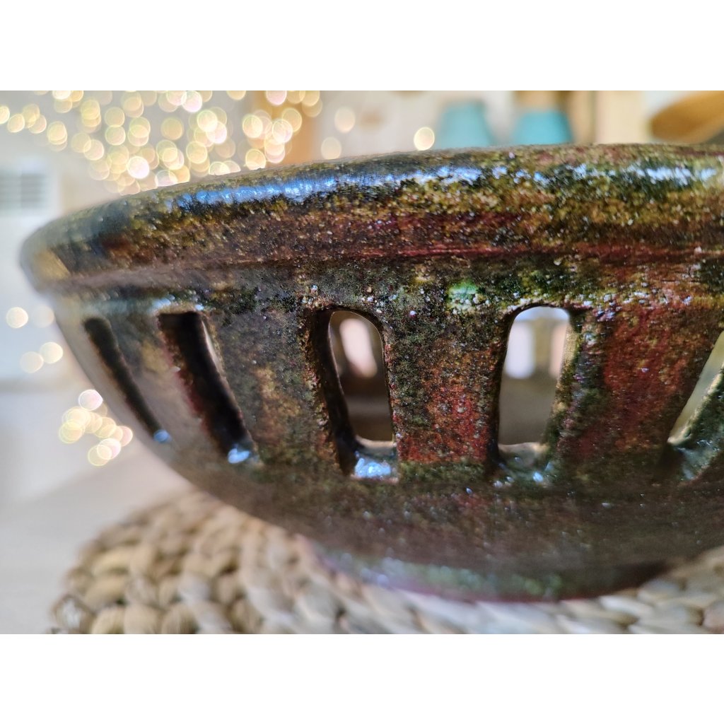 Ez a gyönyörű raku gyümölcsös tál a kézművesség és a természet szépségét egyesíti, tökéletes választás a friss gyümölcsök tálalásához. Egyedi dizájnja és különleges színei feldobják az asztalt, miközben praktikus megoldást kínálnak a gyümölcsök rendezett tárolására.
